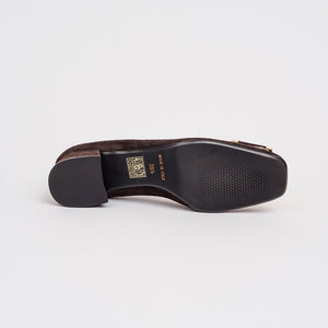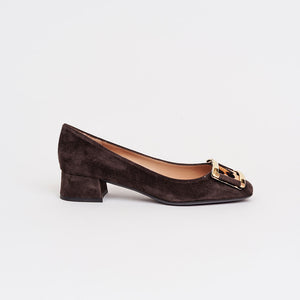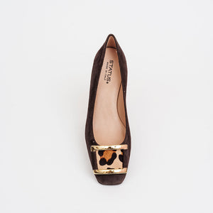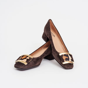 Décolleté con accessorio stampa animalier e fibbia oro, punta squadrata in camoscio tacco 3 cm.