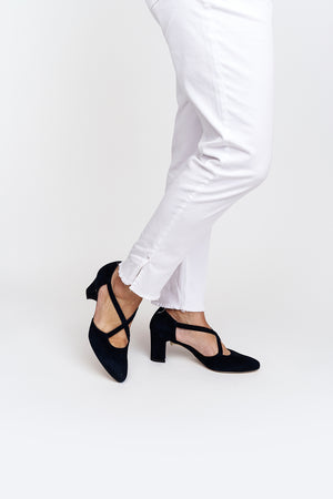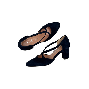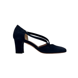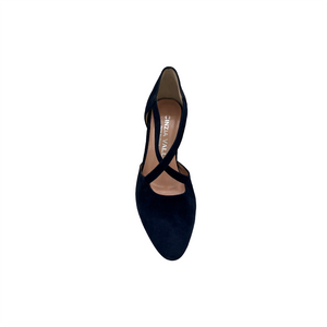 Un connubio perfetto di confort, qualità made in Italy e stile senza compromessi per questo décolleté in camoscio blu con incrocio sul collo del piede.