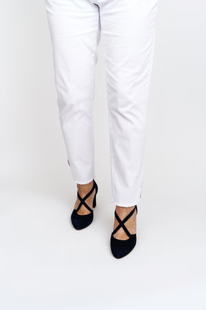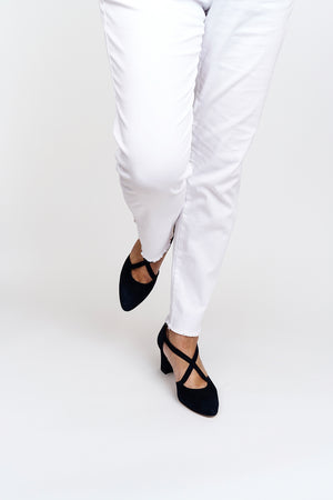 Décolleté in camoscio con incrocio sul collo del piede tacco 6 cm.
