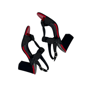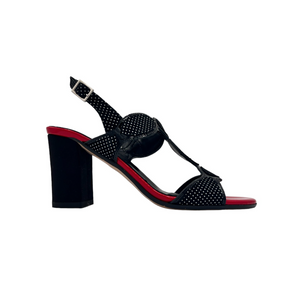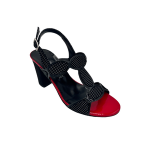 Sandalo dal tacco stabile proposto in una delicata stampa a pois che renderà questa scarpa un accessorio chic per completare ogni look nei colori del rosso, nero o bianco. Apprezzata la scollatura che abbraccia molto bene il piede ma ne lascia libero il collo donando lo slancio adatto ad essere abbinato sia al pantalone che alla gonna.