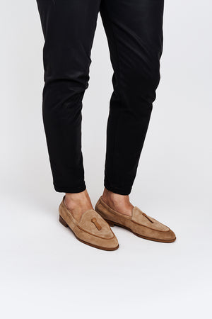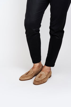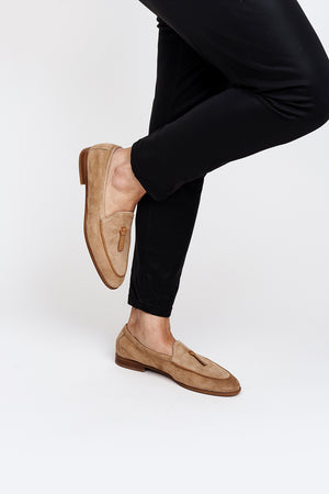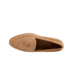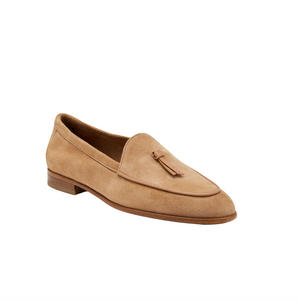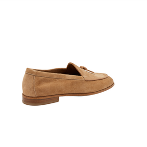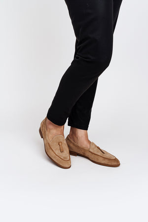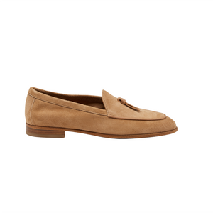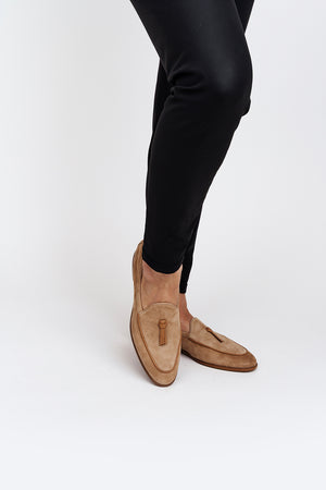 Mocassino affusolato in camoscio beige tacco 2 cm.