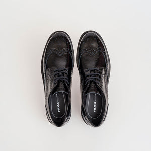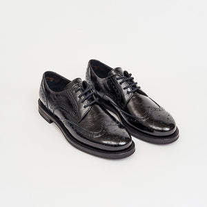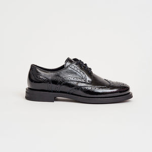 Anche le allacciate, scarpe dal look maschile per eccellenza, diventano iper femminili nella versione in pelle verniciata coda di rondine effetto extra shiny.