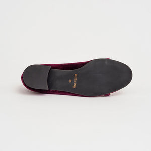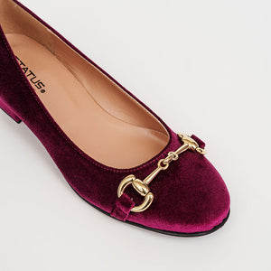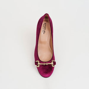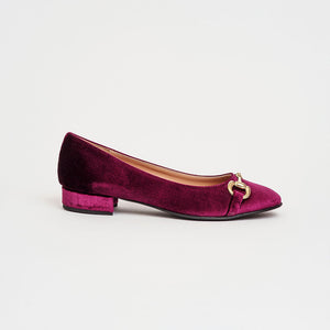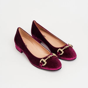 Décolleté bon ton in velluto a punta e scollo arrotondati dalle linee eleganti e femminili, impreziosita dall'accessorio a mo’ di morsetto in metallo dorato.