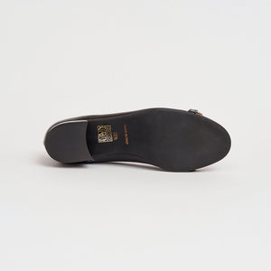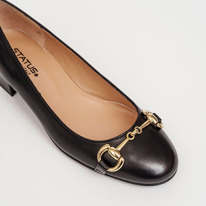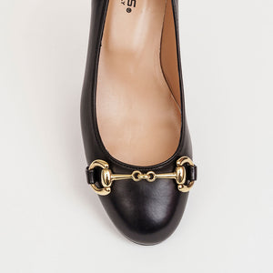 Décolleté bon ton in pelle a punta e scollo arrotondati dalle linee eleganti e femminili, impreziosita dall'accessorio a mo’ di morsetto in metallo dorato.