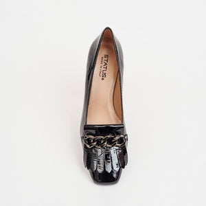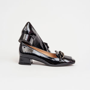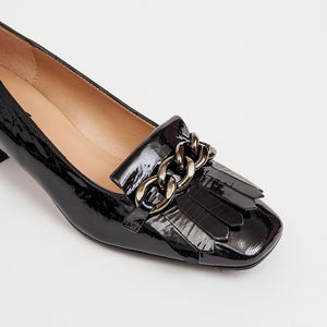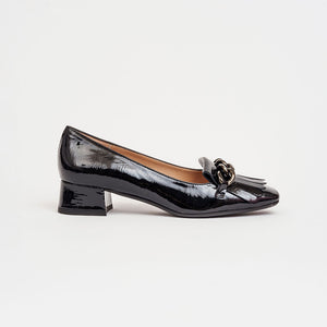 Décolleté in vernice con frangia e catena in tacco 3 cm.
