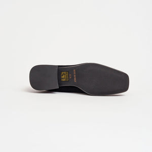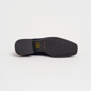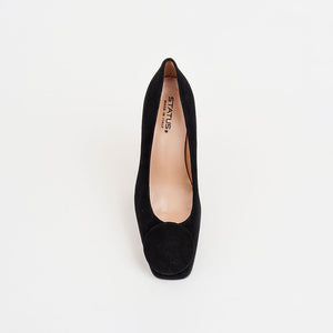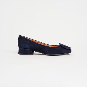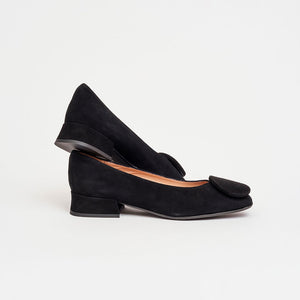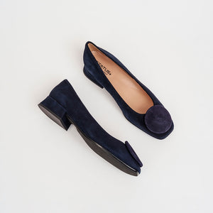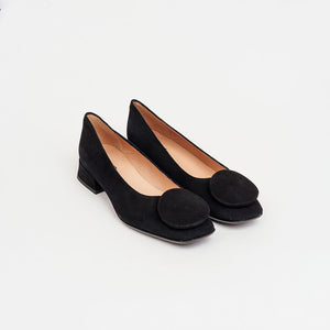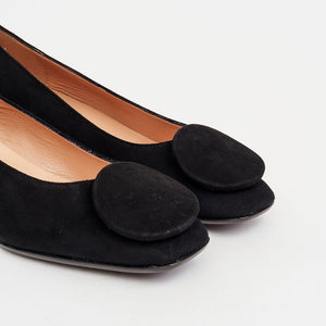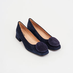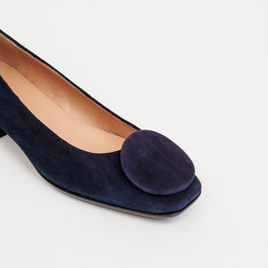 Décolleté bon ton in morbido camoscio a punta leggermente squadrata e scollo arrotondato dalle linee eleganti e femminili. Impreziosita dall'accessorio a mo’ di bottone rivestito del medesimo camoscio.