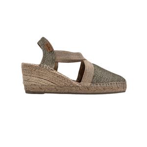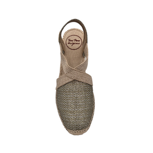 La tomaia è in cotone e lurex, dispone di due elastici a contrasto ad incrociare il collo del piede che rendono la camminata ferma e confortevole.