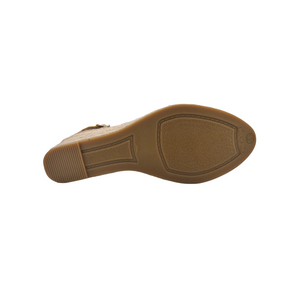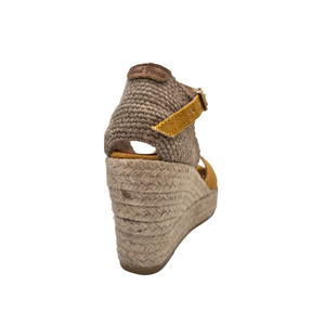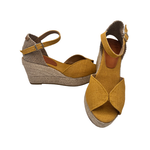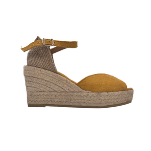 Sandalo in lino con zeppa in iuta e chiusura con fibbia.