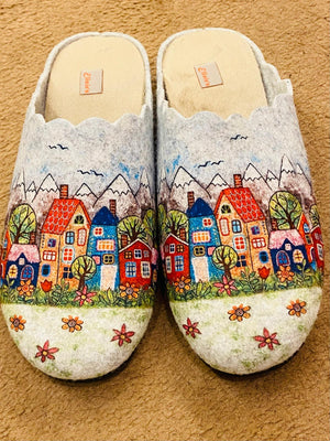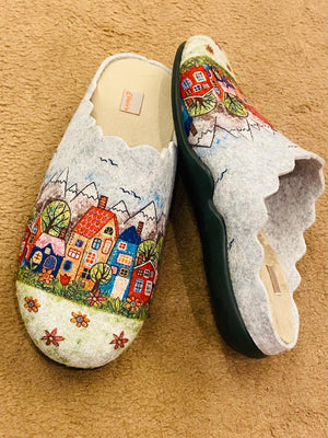 Pianella in lana, calda, confortevole e robusta adatta ad essere indossata in casa ma sfruttabile anche su terrazzi e giardini grazie al fondo in gomma che dona un piacevole sostegno.